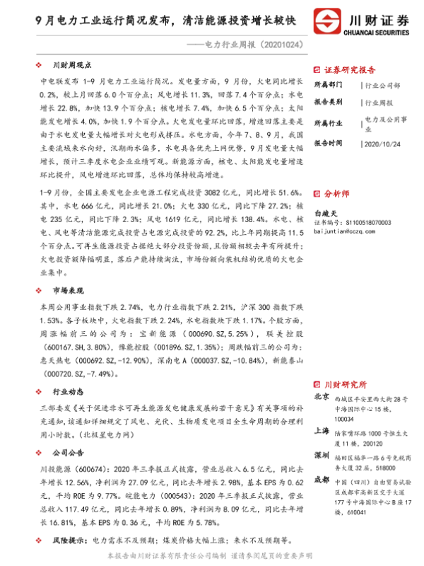 【川财证券】【20201024】9月电力工业运行简况发布,清洁能源投资增长较快-10页
