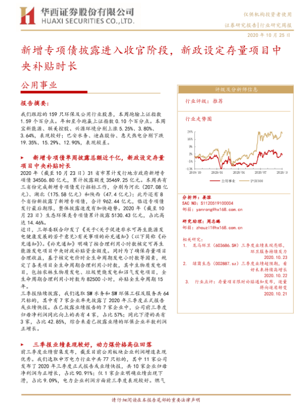 【华西证券】【20201025】公用事业行业研究周报:新增专项债披露进入收官阶段,新政设定存量项目中央补贴时长-17页