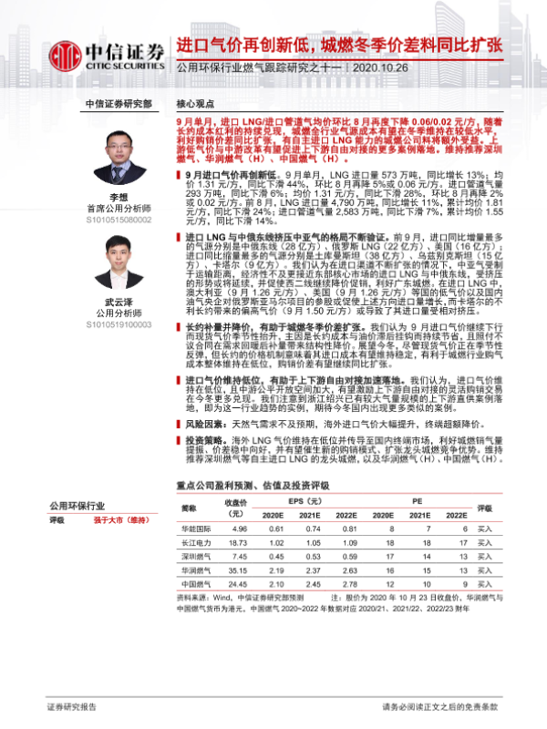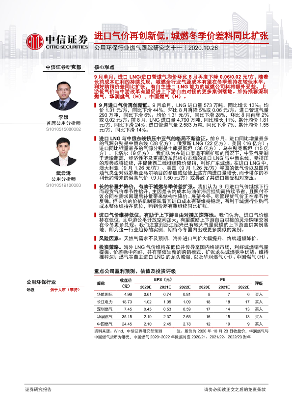 【中信证券】【20201026】进口气价再创新低,城燃冬季价差料同比扩张-4页