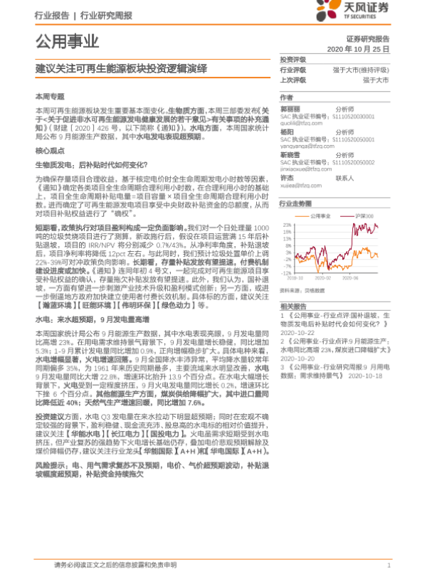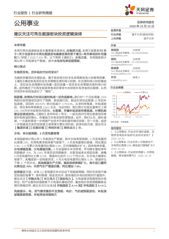 【天风证券】【20201025】公用事业行业研究周报:建议关注可再生能源板块投资逻辑演绎-14页