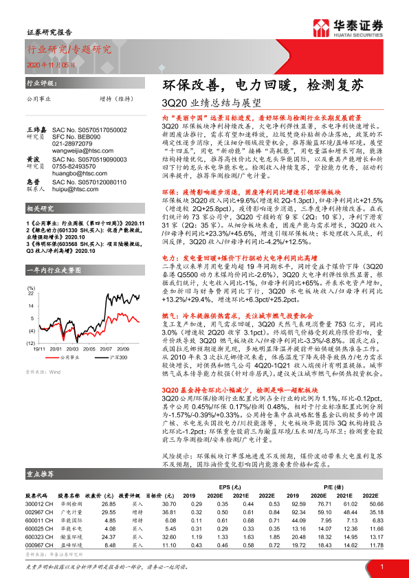 【华泰证券】【20201105】公用事业行业3Q20业绩总结与展望:环保改善,电力回暖,检测复苏-24页