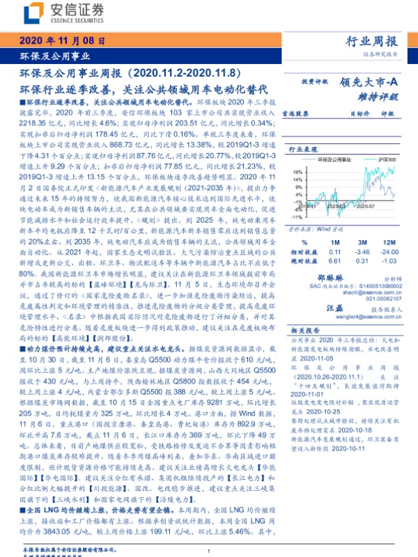 【安信证券】【20201108】环保及公用事业周报:环保行业逐季改善,关注公共领域用车电动化替代-18页