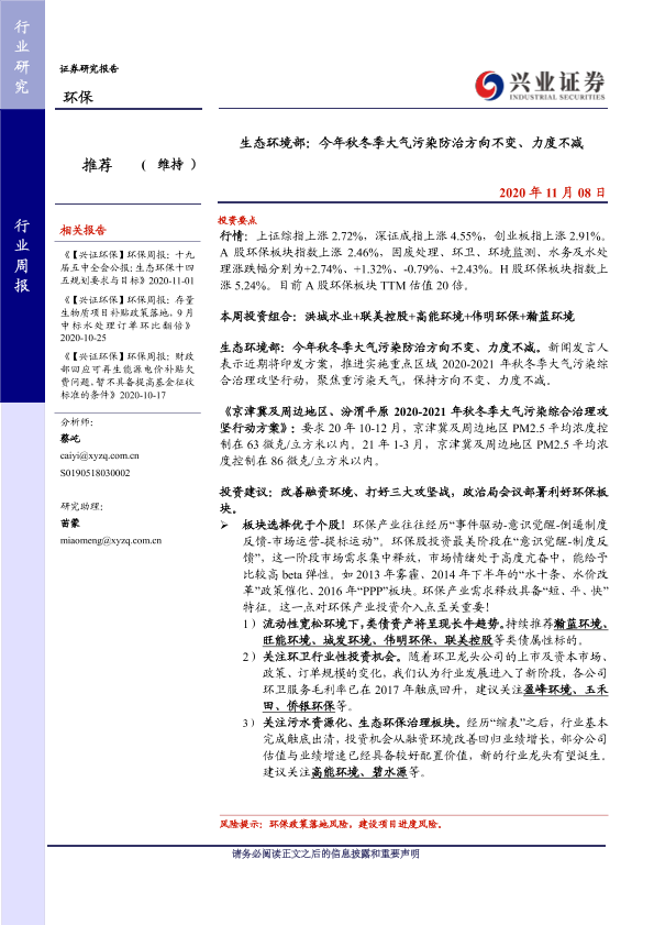 【兴业证券】【20201108】今年秋冬季大气污染防治方向不变、力度不减-7页