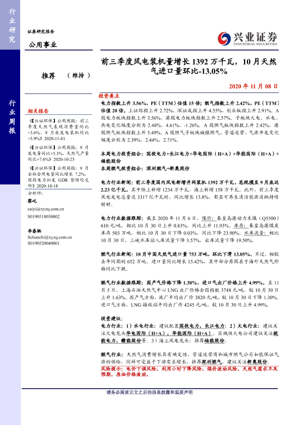 【兴业证券】【20201108】前三季度风电装机量增长1392万千瓦,10月天然气进口量环比减少-13.05%-11页