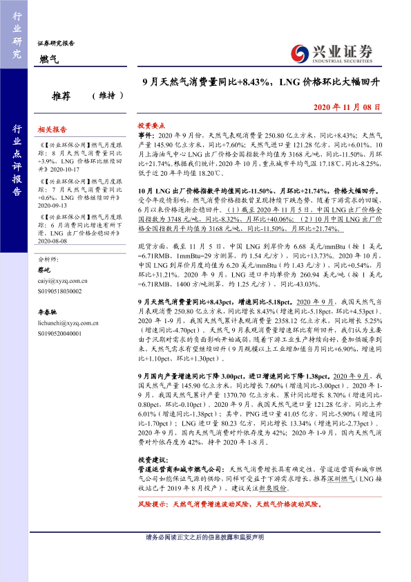 【兴业证券】【20201108】9月天然气消费量同比+8.43%,LNG价格环比大幅回升-8页