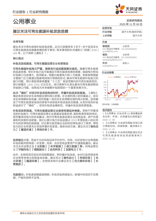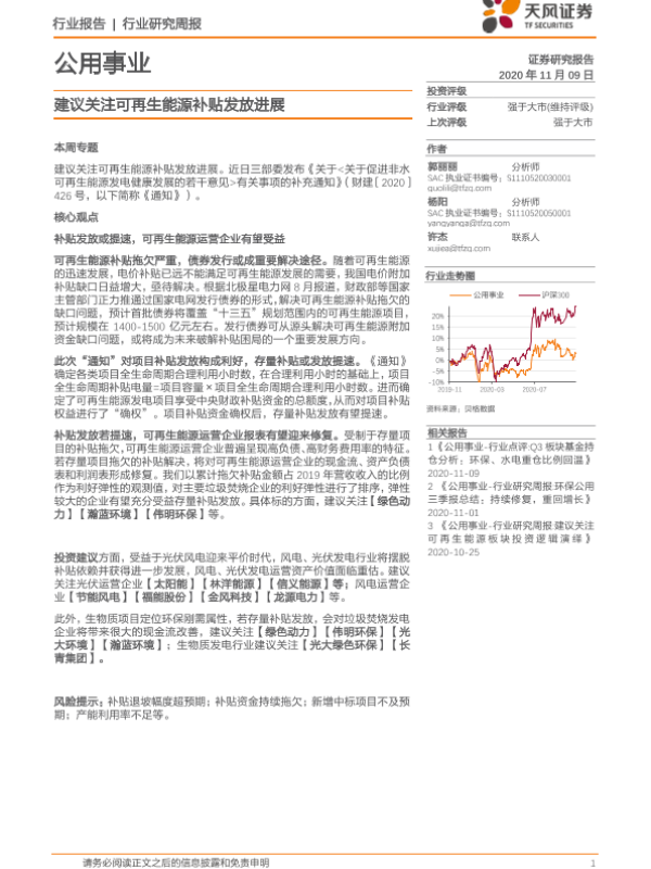 【天风证券】【20201109】公用事业行业:建议关注可再生能源补贴发放进展-15页