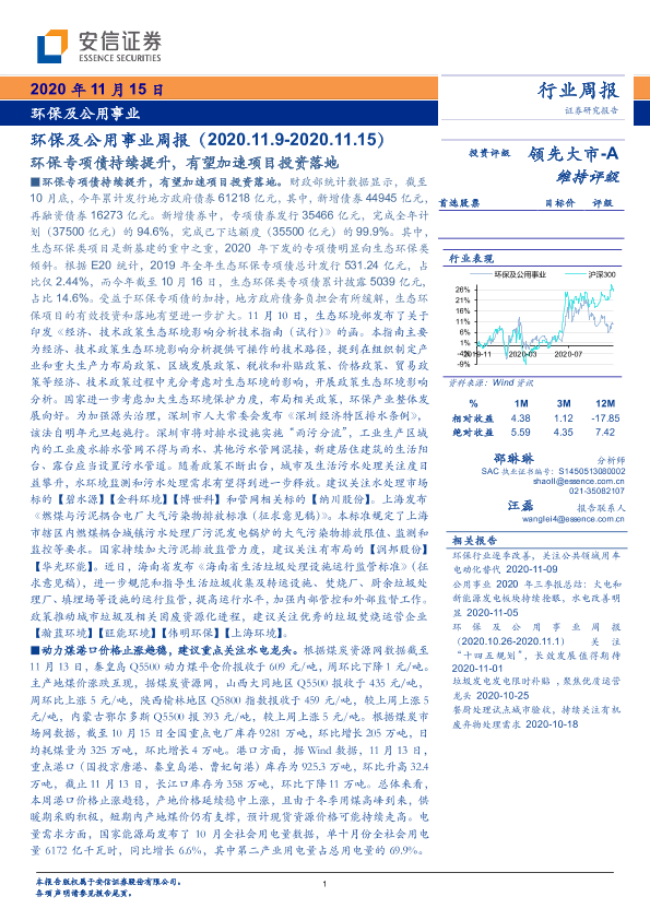 【安信证券】【20201115】环保及公用事业行业周报:环保专项债持续提升,有望加速项目投资落地-16页