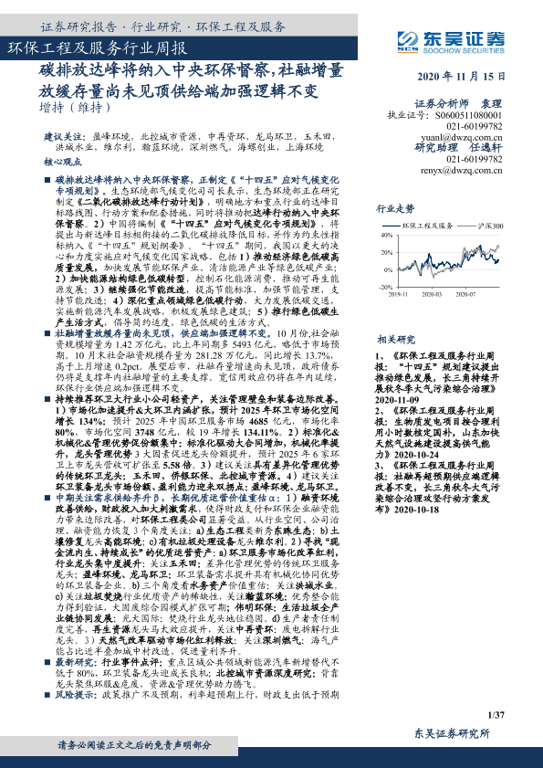 【东吴证券】【20201115】环保工程及服务行业周报:碳排放达峰将纳入中央环保督察-37页