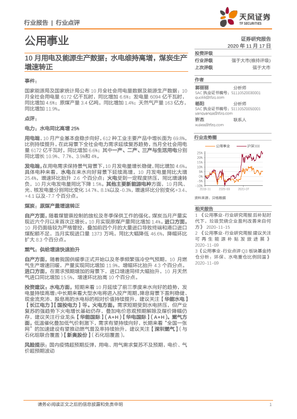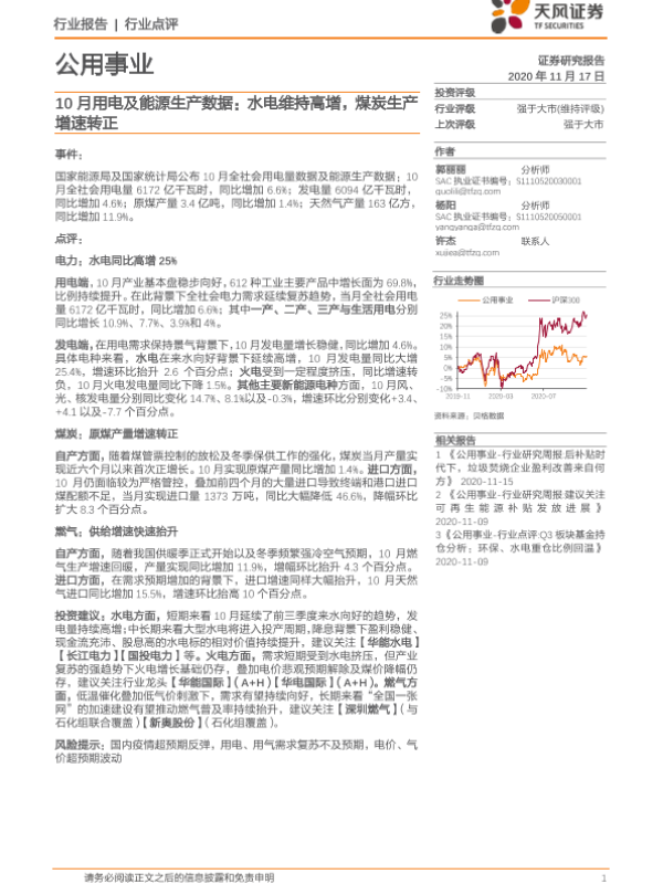 【天风证券】【20201117】10月用电及能源生产数据:水电维持高增,煤炭生产增速转正-6页