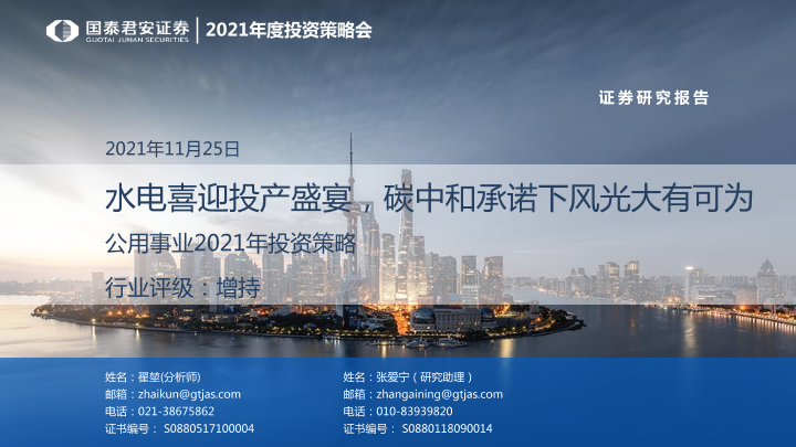 【国泰君安证券】【20201125】2021年公用事业投资策略:水电喜迎投产盛宴,碳中和承诺下风光大有可为-38页