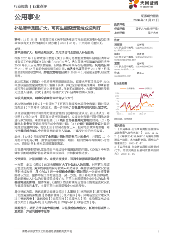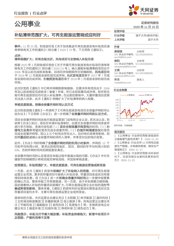 【天风证券】【20201125】公用事业行业点评:补贴清单范围扩大,可再生能源运营端或迎利好-2页