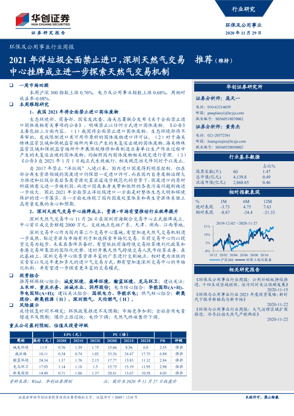 【华创证券】【20201129】环保及公用事业行业周报:2021年洋垃圾全面禁止进口,深圳天然气交易中心挂牌成立进一步探索天然气交易机制-24页