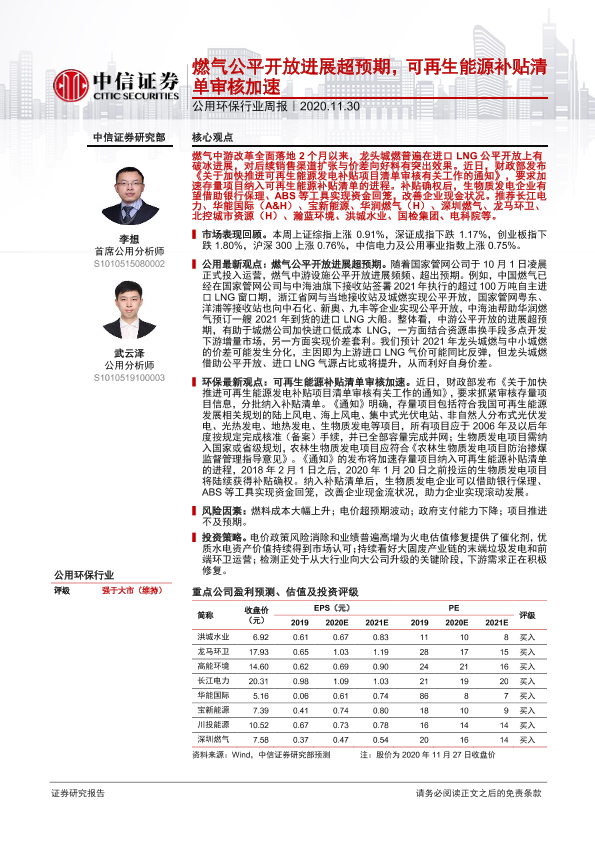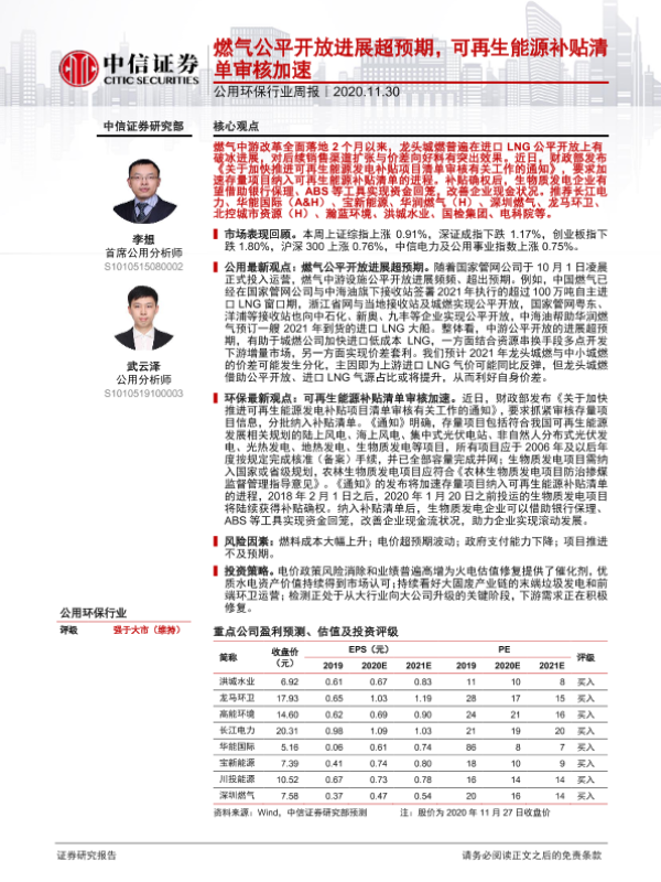 【中信证券】【20201130】公用环保行业周报:燃气公平开放进展超预期,可再生能源补贴清单审核加速-12页
