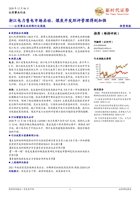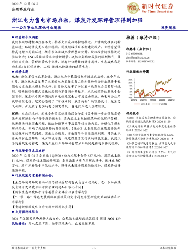 【新时代证券】【20201206】公用事业及环保行业周报:浙江电力售电市场启动,煤炭开发环评管理得到加强-18页