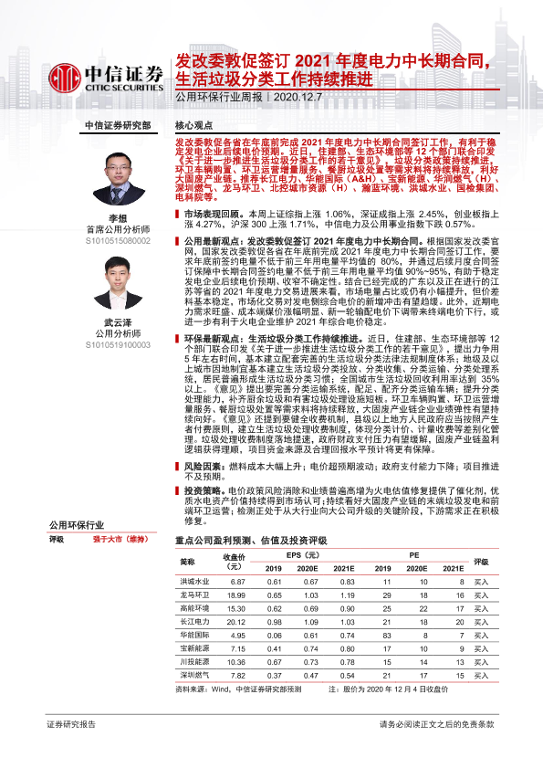 【中信证券】【20201207】公用环保行业周报:发改委敦促签订2021年度电力中长期合同,生活垃圾分类工作持续推进-13页