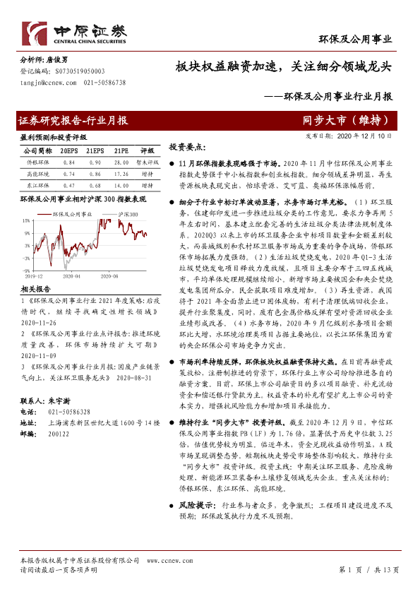 【中原证券】【20201210】环保及公用事业行业月报:板块权益融资加速,关注细分领域龙头-13页