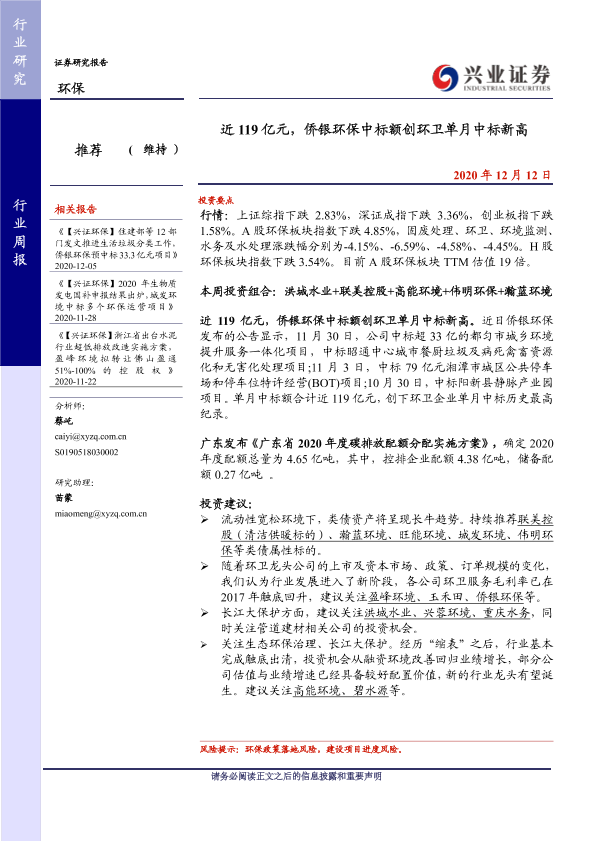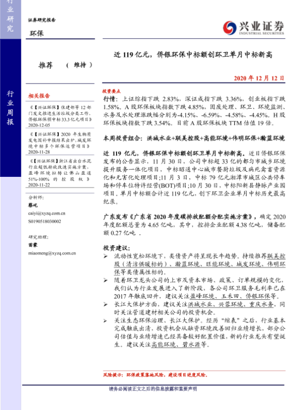 【兴业证券】【20201212】环保行业周报:近119亿元,侨银环保中标额创环卫单月中标新高-7页