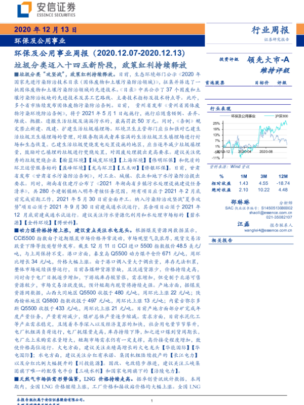 【安信证券】【20201213】环保及公用事业周报:垃圾分类迈入十四五新阶段,政策红利持续释放-18页