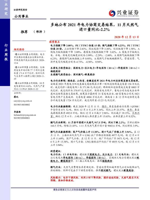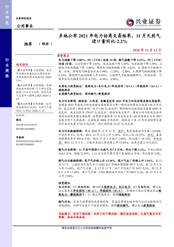 【兴业证券】【20201213】多地公布2021年电力协商交易结果,11月天然气进口量同比-2.2%-12页