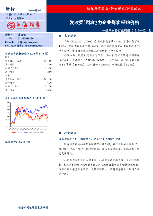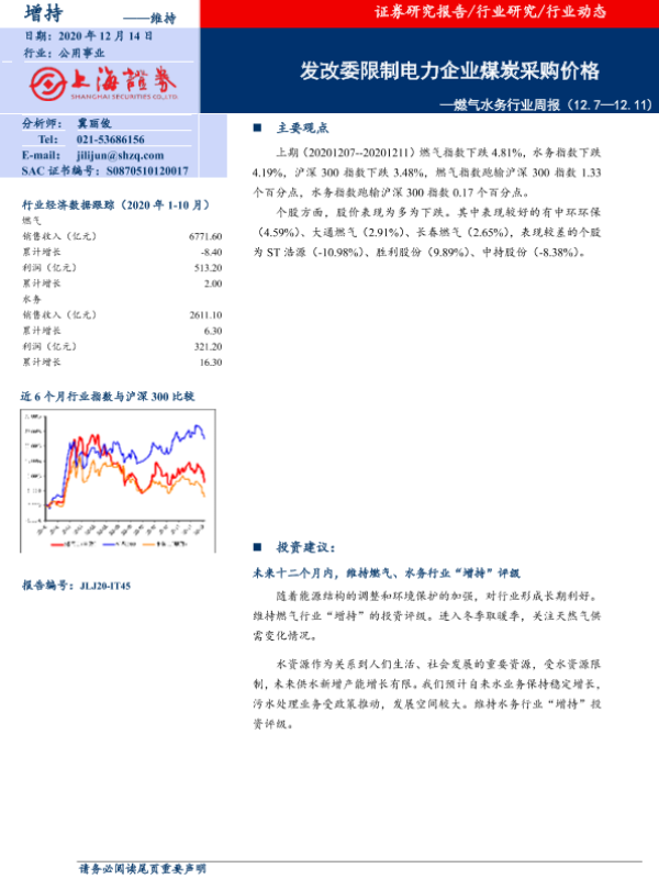 【上海证券】【20201214】燃气水务行业周报:发改委限制电力企业煤炭采购价格-7页