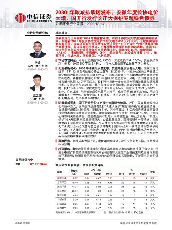 清洁能源 电价 碳减排 绿色债券 长江大保护