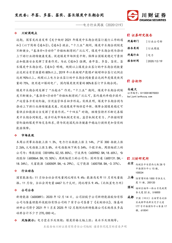 【川财证券】【20201219】电力行业周报:发改委:早签、多签、签实、签长煤炭中长期合同-10页