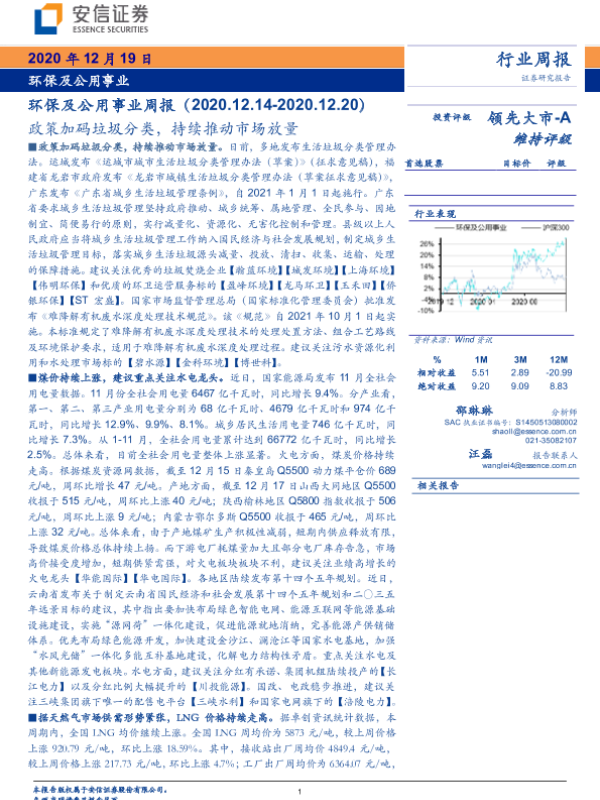 【安信证券】【20201219】环保及公用事业周报:政策加码垃圾分类,持续推动市场放量-18页