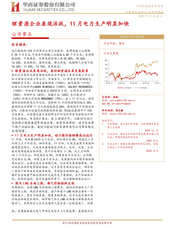 【华西证券】【20201220】公用事业:锂资源企业表现活跃,11月电力生产明显加快-15页