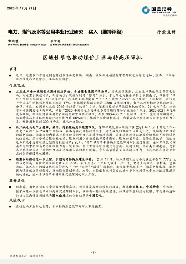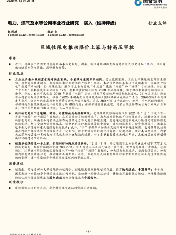 【国金证券】【20201221】电力、煤气及水等公用事业行业研究:区域性限电推动煤价上涨与特高压审批-3页