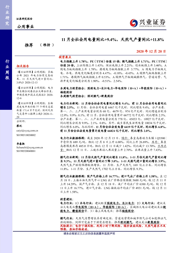 【兴业证券】【20201220】11月全社会用电量同比+9.4%,天然气产量同比+11.8%-12页