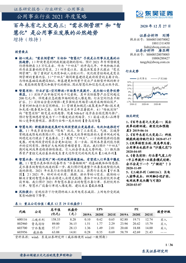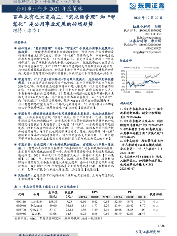 【东吴证券】【20201227】公用事业行业2021年度策略:'需求侧管理'和'智慧化'是公用事业发展的必然趋势-36页