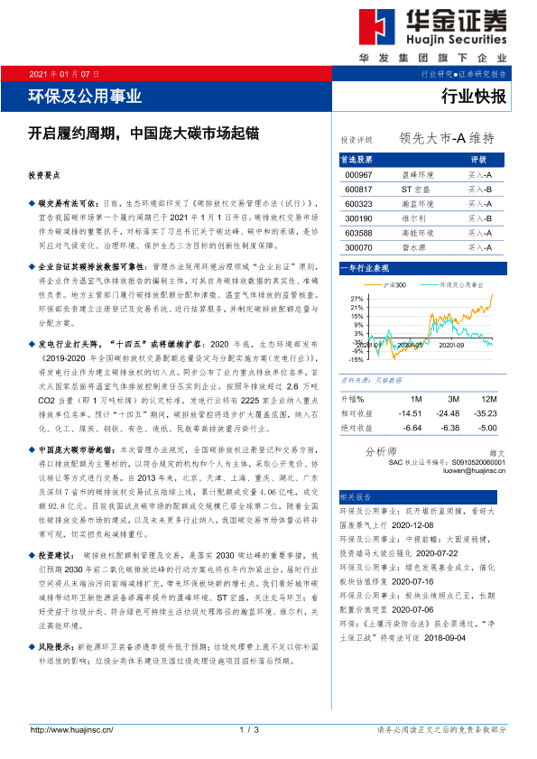【华金证券】【20210107】环保及公用事业:开启履约周期,中国庞大碳市场起锚-3页