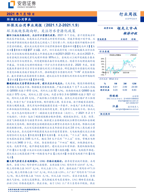 LNG价格 污水资源化 环保政策 环卫服务 碳排放交易