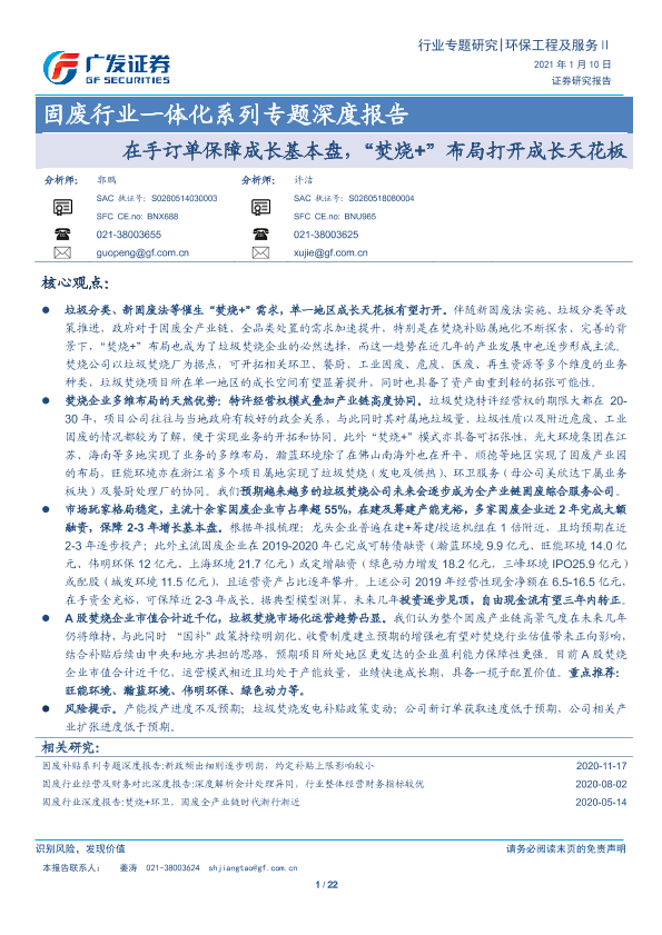 【广发证券】【20210110】固废行业一体化系列专题深度报告:在手订单保障成长基本盘,“焚烧+”布局打开成长天花板-22页