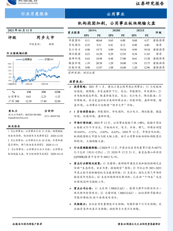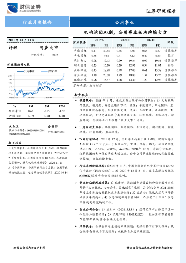 【财信证券】【20210111】公用事业行业月度报告:机构抱团加剧,公用事业板块跑输大盘-13页