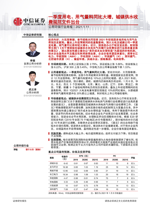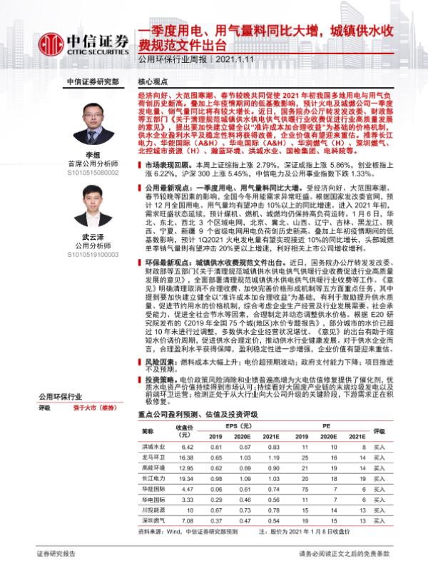 【中信证券】【20210111】公用环保行业周报:一季度用电、用气量料同比大增,城镇供水收费规范文件出台-13页