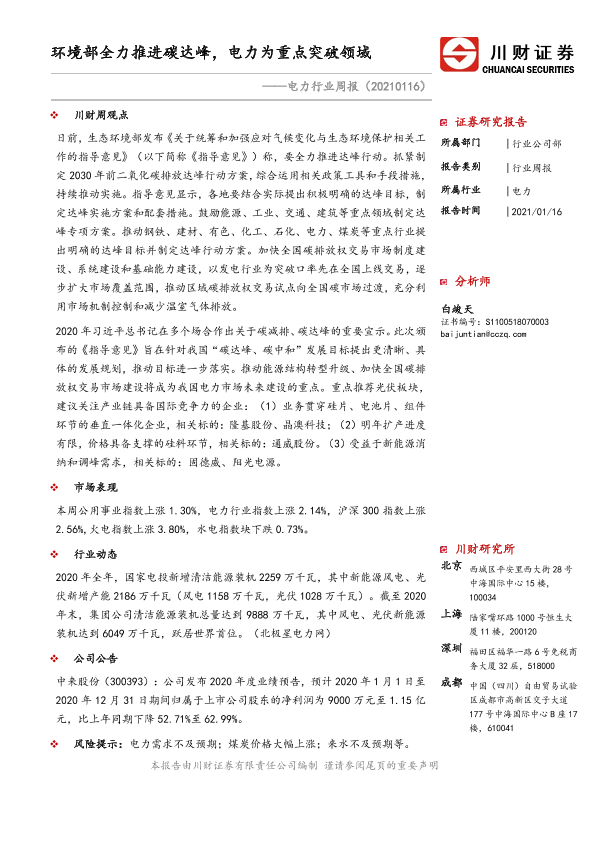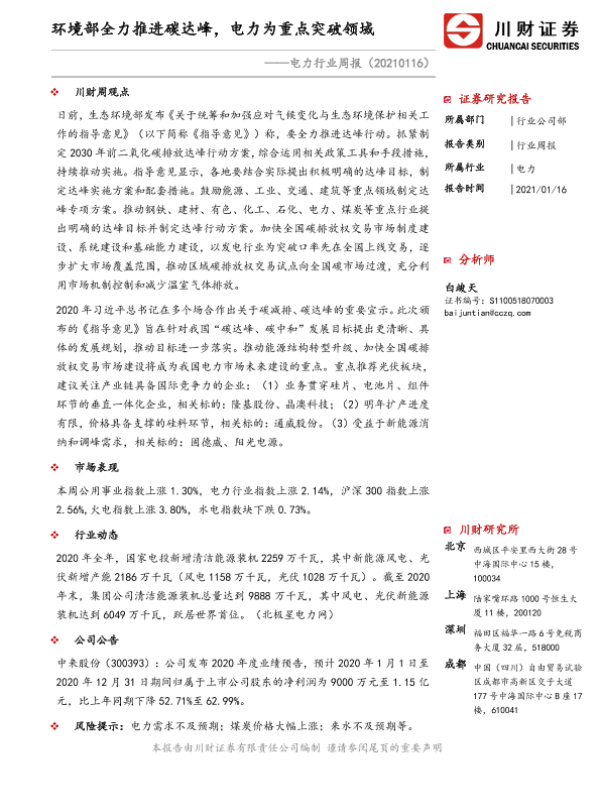 【川财证券】【20210116】电力行业周报:环境部全力推进碳达峰,电力为重点突破领域-10页