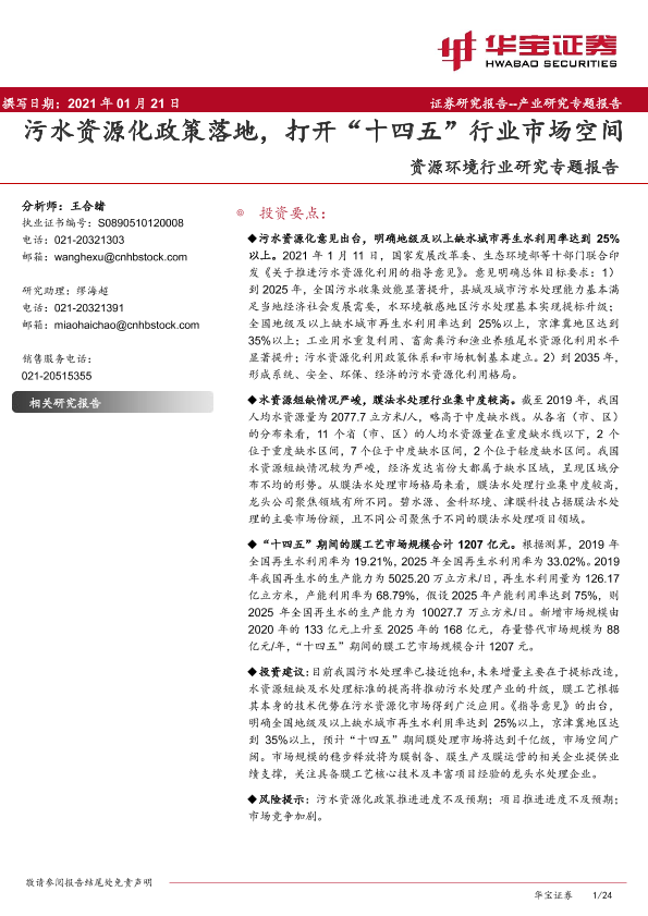 【华宝证券】【20210121】资源环境行业研究专题报告:污水资源化政策落地,打开“十四五”行业市场空间-24页