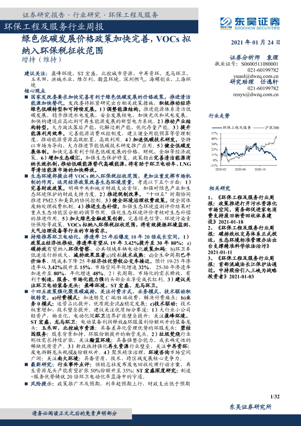 【东吴证券】【20210124】环保工程及服务行业周报:绿色低碳发展价格政策加快完善,VOCs拟纳入环保税征收范围-32页