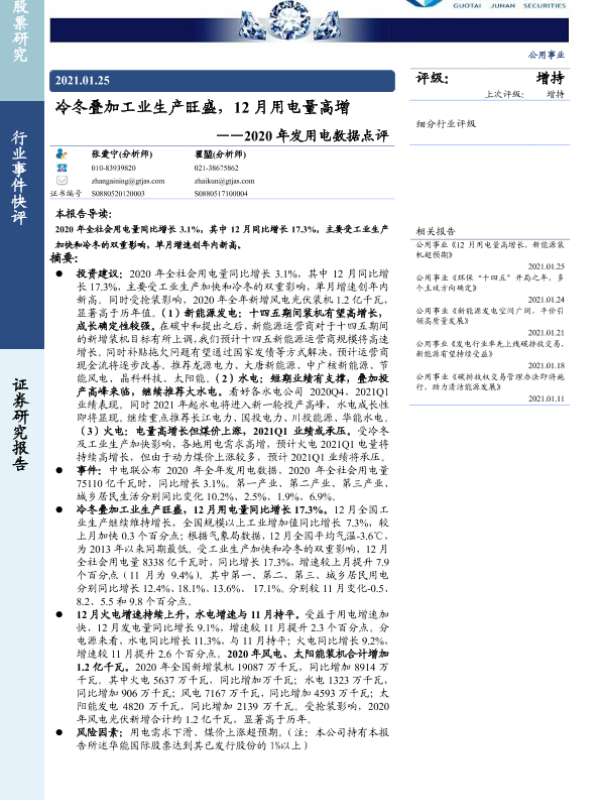【国泰君安证券】【20210125】2020年发用电数据点评:冷冬叠加工业生产旺盛,12月用电量高增-6页