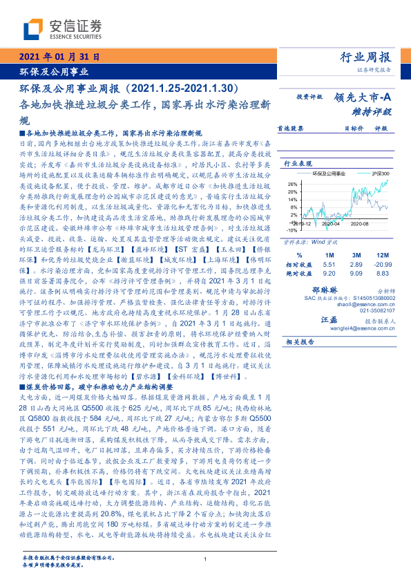 【安信证券】【20210131】环保及公用事业行业周报:各地加快推进垃圾分类工作,国家再出水污染治理新规-18页