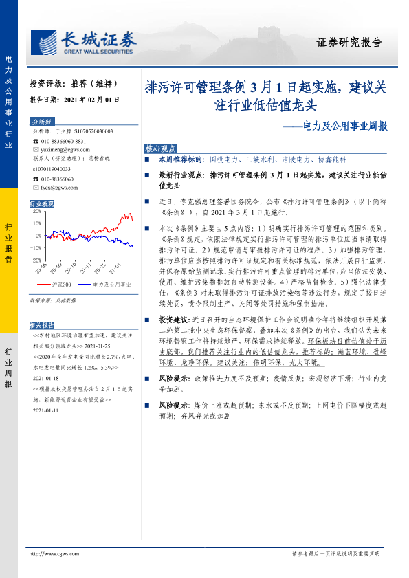 【长城证券】【20210201】电力及公用事业周报:排污许可管理条例3月1日起实施,建议关注行业低估值龙头-11页