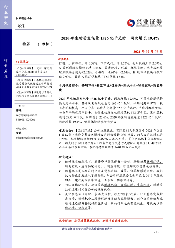可再生能源 投资建议 政策动态 环保行业 生物质发电