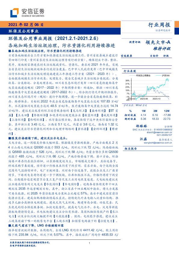 【安信证券】【20210206】环保及公用事业周报:各地加码生活垃圾治理,污水资源化利用持续推进-17页