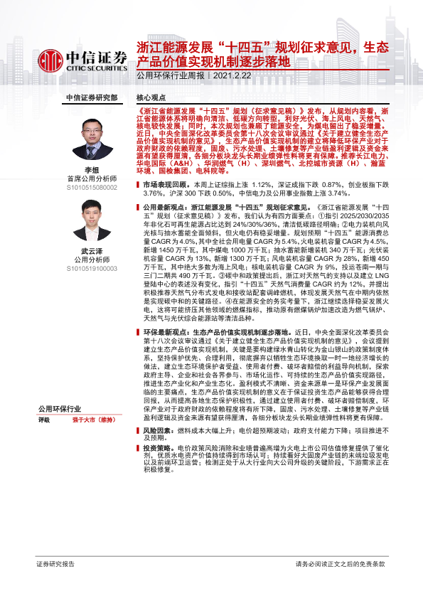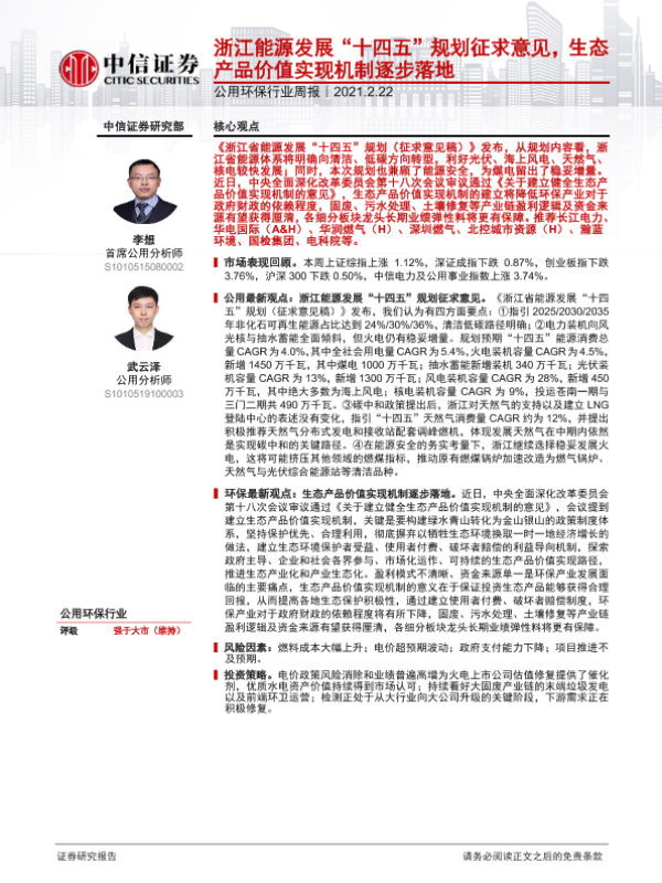 【中信证券】【20210222】公用环保行业周报:浙江能源发展‘十四五’规划征求意见,生态产品价值实现机制逐步落地-12页