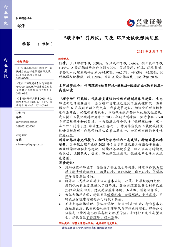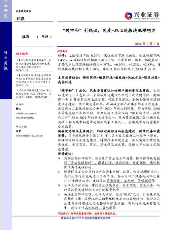 【兴业证券】【20210307】环保行业周报:“碳中和”引热议,固废+环卫处板块涨幅明显-8页