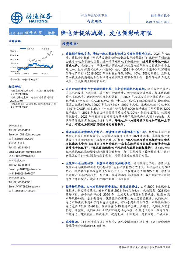 【海通证券】【20210308】公用事业行业周报:降电价提法减弱,发电侧影响有限-2页