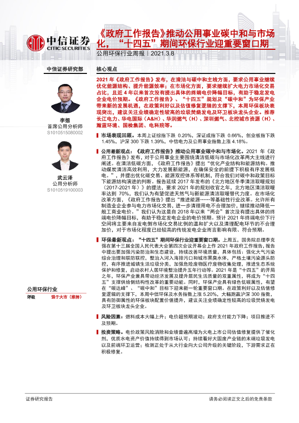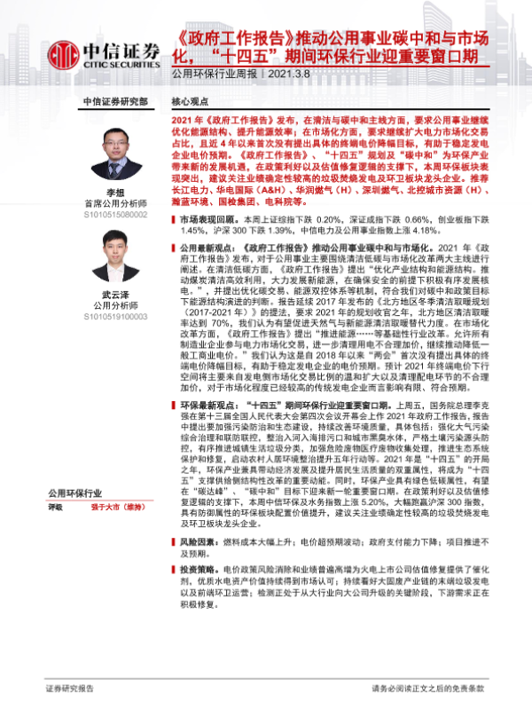 【中信证券】【20210308】公用环保行业周报:《政府工作报告》推动公用事业碳中和与市场化,“十四五”期间环保行业迎重要窗口期-13页