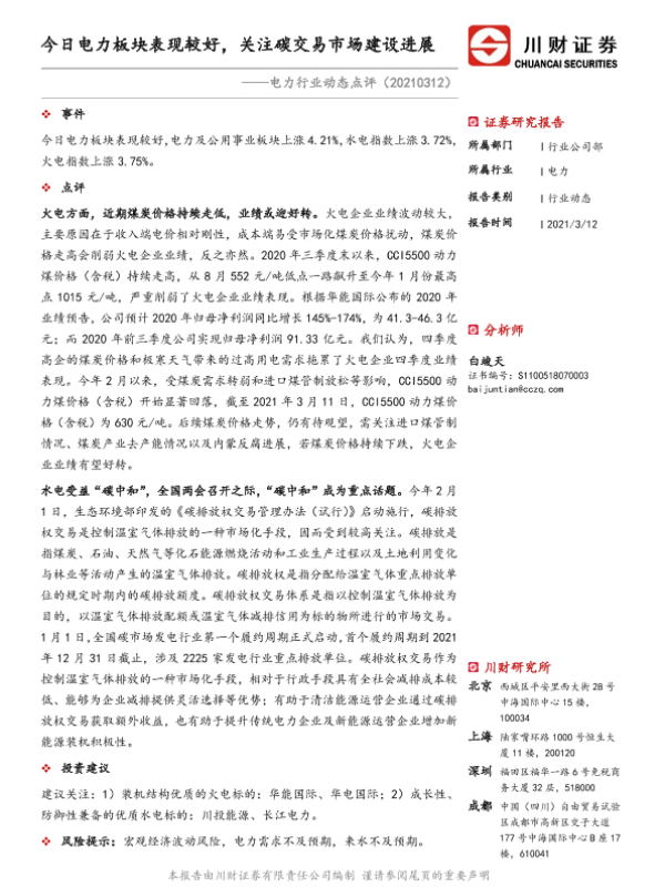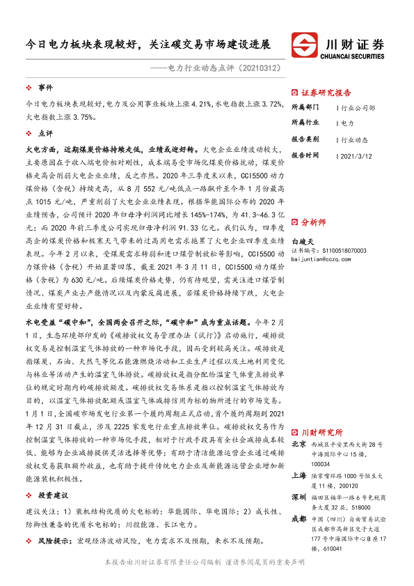【川财证券】【20210312】电力行业动态点评:今日电力板块表现较好,关注碳交易市场建设进展-2页
