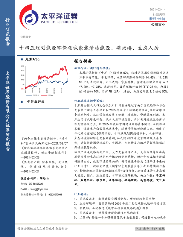 【太平洋证券】【20210314】公用事业行业周报:十四五规划能源环保领域聚焦清洁能源、碳减排、生态人居-13页